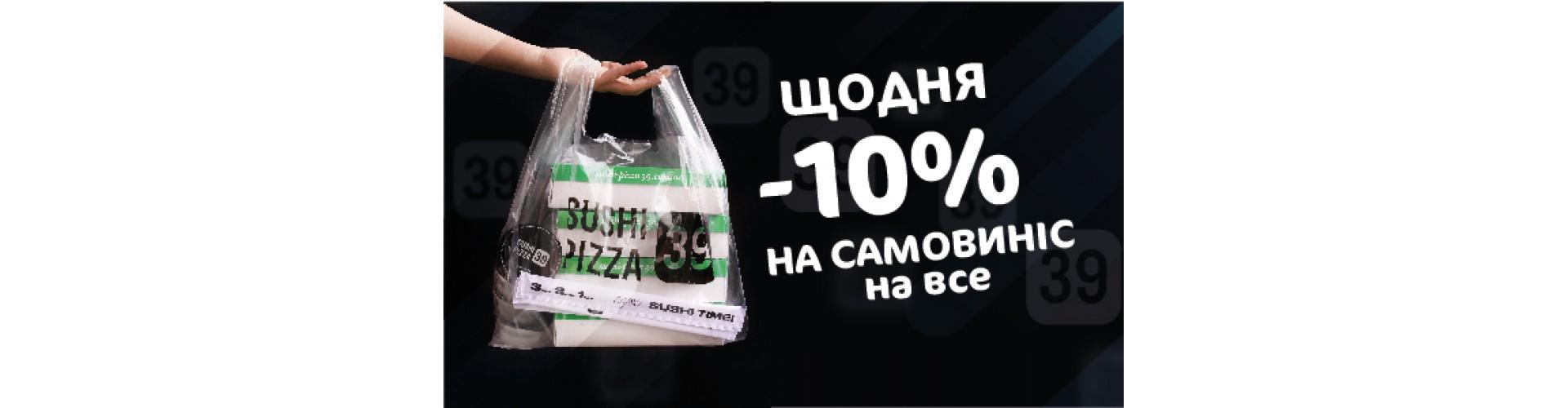 ЩОДНЯ! Робіть замовлення з собою, заходьте на найближчу локацію мережі закладів Суші Піца 39 та забирайте улюблені страви зі знижкою 10%*. Мінімальної суми замовлення при цьому немає.