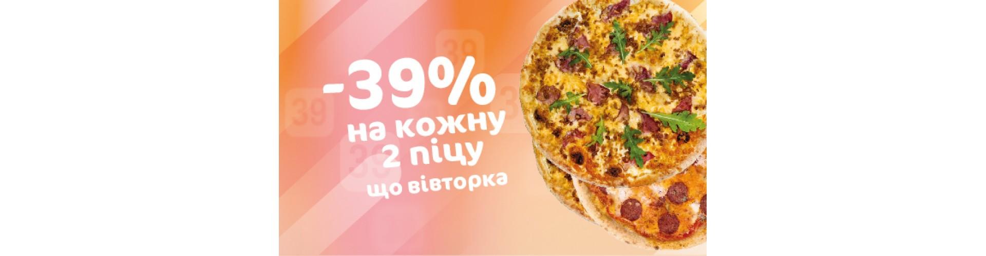 ЩОВІВТОРКА! Знижка 39% на кожну 2 піцу в чеку*. Замовляй улюблені піци з неймовірною вигодою. Доставимо за 39 хвилин** або ж заїжджайте та забирайте самі на будь якій зручній локації мережі. Знижка діє щовівторка. Замовляйте піци стільки - скільки подужаєте. Акція діє на доставку, на самовиніс, а також в закладах Sushi Pizza 39 формату КАФЕ.